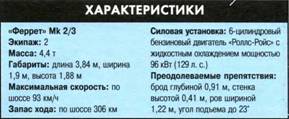 В1946 году британское военное ведомство заказало разработку нового разведывательного бронеавтомобиля. В следующем году фирма «Даймлер» из города Ковентри выиграла тендер и приступила к проектным работам. Представленный в 1949 году опытный образец успешно прошел испытания и был рекомендован к принятию на вооружение. Выпуск машины, получившей обозначение «Феррет», продолжался до 1971 года, было произведено более 4400 бронеавтомобилей этого типа. Помимо ВС Великобритании бронеавтомобили «Феррет» поставлялись еще в 30 стран мира. Отделение механика- водителя находилось в передней части, в центре располагалось боевое отделение (там находилось место командира, который одновременно выполнял функции стрелка), сзади - моторно-трансмиссион- ное отделение. Сварная броня толщиной 12 мм обеспечивала защиту экипажа от пуль и небольших осколков.