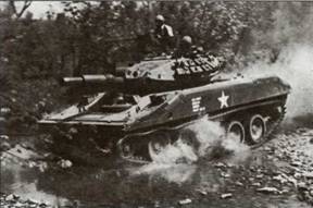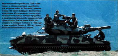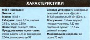 После 1983 года лишь один танковый батальон М551 оставался на вооружении 82-й воздушно-десантной дивизии, да еще некоторое количество - в составе Национальной гвардии штата Арканзас. Остальные машины были отправлены в национальный учебный центр сухопутных войск в калифорнийский Форт-Ирвин, где их использовали для имитации техники потенциального противника в ходе боевой подготовки частей и подразделений. Там М551 имитировали советские ЗСУ-23-4 «Шилка», БМП-1 и 122-мм САУ 2СЗ «Гвоздика». Корпус М551 был сварным, изготавливался из алюминиевых сплавов, а башня - из стальной брони. Механик-водитель размещался в передней части корпуса по центру, башня - в средней части корпуса, в корме - моторно-трансмиссион- ное отделение. Ходовая часть включала торсионную подвеску, по пять сдвоенных обрези- ненных опорных катков с каждого борта, ведущие колеса - сзади, ленивцы - спереди. При установке опоясывающих поплавков машина могла двигаться на плаву с максимальной скоростью 5,8 км/ч за счет вращения гусеничных лент.