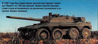 В 1976 году южноафриканкие специалисты построили три прототипа боевой бронированной машины с колесной формулой 8x8 для экспериментальной проверки новой концепции. В начале 1980-х были изготовлены еще три опытные машины, одна из которых послужила базой для создания боевой разведывательной машины с тяжелым вооружением «Руикат». Эта машина предназначена для ведения разведки в условиях маневренных боевых действий, в том числе путем обхода противника и проникновения в его тылы. Благодаря мощному вооружению «Руикат» способен вести борьбу с бронированными целями, в том числе БМП. Механик-водитель расположен в передней части сварного корпуса, в центральной части установлена башня с местами для трех членов экипажа, в корме - моторно- трансмиссионное отделение. Броня лобовой части выдерживает попадание снаряда калибра 23 мм.
