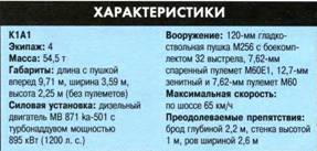 Внешний вид танка дает основание полагать, что конструкторы взяли за основу американский танк М1 «Абраме», несколько адаптировав модель в соответствии с местными условиями. В первую очередь это касалось требований командования создать боевую машину, обладающую высокой маневренностью и способную действовать на всех типах характерной для Кореи местности - в джунглях и на рисовых полях, в горно-лесистых, болотистых и каменистых районах. Экипаж танка состоит из четырех человек - командира, механика-водителя, наводчика и заряжающего. К1 оснащен дизельной силовой установкой мощностью 895 кВт (1200 л. е.). Вооружение включает 105-мм пушку, 7,62-мм спаренный пулемет, а также два турельных пулемета, установленных сверху башни, - 12,7-мм командира и 7,62-мм заряжающего.