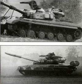 Вверху. В корме этого Т-80 установлены дополнительные топливные емкости. Несмотря на некоторую схожесть с Т-64, новый танк имел более мощную броневую защиту, усовершенствованную ходовую часть, а вместо силовой установки Т-64 мощностью 559 кВт (750 л. с.) в Т-80 установили газотурбинный двигатель мощностью 746 кВт (1000л. е.).