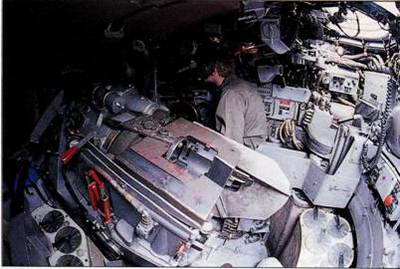 Внизу. В башне расположены три из четырех членов экипажа танка. Слева от казенной части орудия находится место командира, справа - заряжающего и впереди него - наводчика. Сиденье наводчика специальное, позволяющее неотрывно наблюдать за целью в прицел вне зависимости от колебаний, тряски и вибрации корпуса при движении по неровной местности.