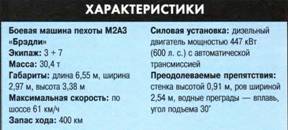 К настоящему времени проведено три этапа модернизации «Брэдли» (до стандартов А1, А2 и A3), в ходе последней машина была оснащена динамической защитой, командирским тепловизион- ным прибором наблюдения, усовершенствованными двигателем и трансмиссией. Гусеничное шасси БМП стало основой при создании реактивной системы залпового огня MLRS. Наиболее специализированными вариантами машин семейства «Брэдли» являются бронированная машина огневой поддержки М7 FIST (Fire Support Team) и Мб «Брэдли лайнбейкер», оснащенная пусковой установкой (четыре направляющие) зенитных управляемых ракет «Стингер» вместо пусковой установки (две направляющие) противотанковых ракет TOW.