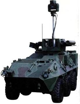 «Пандур» может быть оснащен различными системами наблюдения и вооружения. На рисунке показан вариант с пулеметом и двумя пусковыми установками противотанковых ракет НОТ, а также приборами обнаружения на вьщвигающейся мачте. С помощью компьютерного моделирования корпусу машины была придана форма с наименьшей площадью эффективного рассеивания, снижающая радиолокационную заметность.