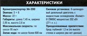 Бронетранспортер ХА-200 с колесной формулой 6 х 6 является новейшей машиной семейства ХА финской фирмы «Патрия виклз» (ранее называлась «Сису виклз»), насчитывающего более 700 единиц. К 2004 году финской армии должно быть поставлено 100 БТР ХА-200, шведской армии поставлено 104 ХА-202 (86 БТР XA-203S и 18 командно- штабных машин XA-202S) и еще 64 должно быть передано к 2004 году. Норвегия заказала 32 таких БТР. Кроме базовой модели, созданной на основе БТР ХА185, разработаны также ко- мандно-штабная и ремонтно- эвакуационная машины, самоходные противотанковый и зенитный ракетные комплексы, медико-санитарная машина, мобильные узел связи и РЯС со складывающейся мачтой, миноукладчик, самоходный миномет и машина радиационной и химической разведки. БТР имеет экипаж три человека и может перевозить восемь полностью экипированных пехотинцев. Доступ в десантное отделение и спешивание осуществляются через две двери в корме машины и два люка в крыше. Корпус машины сварен из стальных броневых листов повышенной прочности, что обеспечивает защиту от стрелкового и крупнокалиберного (до 14,5 мм) оружия, а также осколков снарядов и мин. Силовая установка представлена дизельным двигателем и автоматической трансмиссией с электронным управлением MD 3560PR «Эллисон».