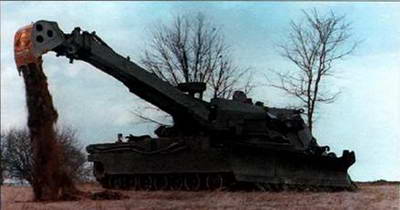 В передней части поворотной башни установили А-образную стрелу грузоподъемностью 15,8 т, которая в походном положении откидывается назад и находится над моторно-трансмиссион- ным отделением. В передней части корпуса смонтировали бульдозерное оборудование с гидроприводом - мощный отвал может использоваться для разграждения и проведения других инженерных работ, включая подготовку огневых позиций. Стандартная комплектация включала также приборы ночного видения (в том числе И К-прожектор), систему защиты от ОМП и оборудование для подводного вождения.