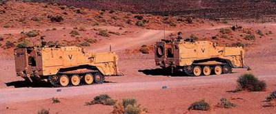 Слева. Два бульдозера М9 на марше в районе Ближнего Востока. В походном положении ходовая часть поднимается гидропневматической подвеской, а при больших усилиях для перемещения грунта корпус опускается для придания большей устойчивости.