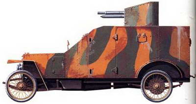 Первые бронеавтомобили выпускались фактически кустарно. Радиатор и двигатель были защищены тонкими стальными пластинами. Несмотря на то что масса бронеавтомобиля существенно возросла по сравнению с обычным автомобилем, шасси оставили практически без изменений, использовали обычные колеса со спицами, лишь позднее на задней оси стали устанавливать сдвоенные колеса. Постепенно нарастили и мощь вооружения - вместо пулемета стали устанавливать модернизированную 37-мм пушку, которая применяла осколочно-фугасные боеприпасы. Существовали также модификации с двумя пулеметами и смешанным вооружением - пулеметом и пушкой. Таким образом, бронеавтомобили превратились в средство огневой поддержки пехоты.