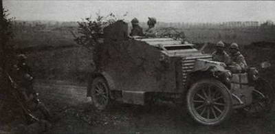 Французский бронеавтомобиль «Пежо», выполнявший в апреле 1918 года задачи по непосредственной поддержке английской пехоты. Из-за низкой проходимости такие машины могли передвигаться только по дорогам либо по ровной открытой местности.
