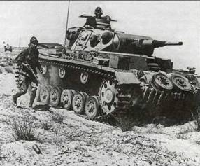 Справа. Танки T-III стали главной ударной силой немецкого Африканского корпуса в первые два года войны, хотя их надежность в крайне тяжелых климатических условиях заметно снизилась.