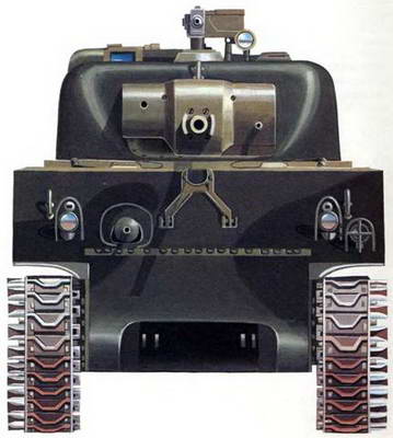 Лобовая проекция показывает угловатость форм корпуса, что было обусловлено необходимостью быстрого и массового производства. В корпусе имелись три люка: один в днище танка, предназначенный для аварийного покидания машины, и два в верхней передней части - для механика-во- дителя (слева) и стрелка курсового пулемета (справа). В качестве курсового обычно применяли пулемет М1919А4 «Браунинг» калибра 7,62 мм.