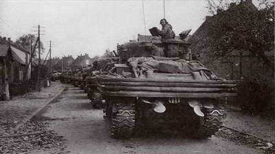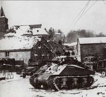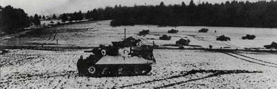 Средние танки М4 активно использовались американскими войсками с лета 1944 года, особенно в операциях на северо-западе Европы. Сзади слева виден полугусеничный транспортер М3. Конечно, М4 уступали по своим боевым возможностям немецким «Тиграм» и «Пантерам», но их было много и у союзников не было проблем с топливом.