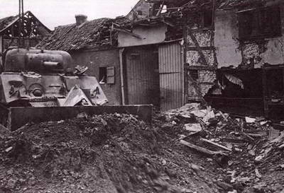 В ходе городских боев на танки нередко возлагались и инженерно-саперные задачи. Навесное оборудование нередко использовалось так же часто, как штатное вооружение. На снимке М4 с бульдозерным отвалом из состава 1-й полевой армии США расчищает проход на улице немецкого города.