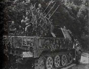 Справа. 8-тонный артиллерийский полугусеничный транспортер SdKfz 7 вмещал весь расчет орудия, в кормовой части имелось отделение для перевозки боеприпасов или имущества. Для защиты от непогоды был предусмотрен брезентовый тент, однако он редко использовался, поскольку затруднял обзор.