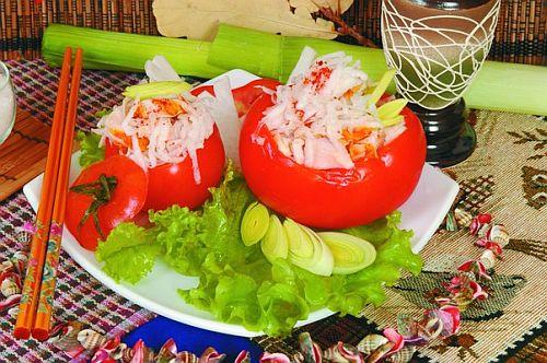 Листья салата вымыть, обсушить, выложить на блюдо. Огурец вымыть, нарезать кружочками. Филе утки нарезать небольшими кусочками, смешать с рисом, добавить рисовый уксус и перец, перемешать. Помидоры вымыть, срезать верхушки, вынуть чайной ложкой часть мякоти с семенами и нафаршировать приготовленной начинкой. Выложить помидоры на листья салата, посыпать семенами кунжута и оформить кружочками огурца.