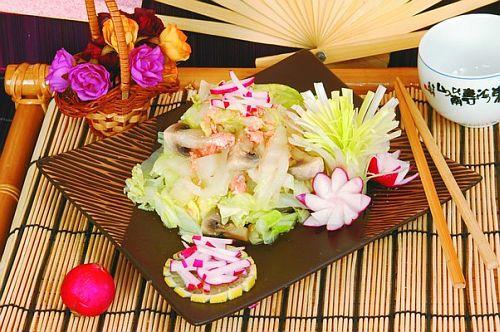 Филе семги промыть, отварить в подсоленной воде, охладить, мелко нарезать. Шампиньоны вымыть, крупно нарезать. Капусту вымыть, нашинковать. Редис вымыть, из одного корнеплода вырезать цветок лилии, остальные нарезать соломкой. Лук-порей вымыть, отрезать от стебля кусочек длиной 5 см, вырезать из него цветок хризантемы и положить в холодную воду. Остальной лук мелко нарезать, тушить вместе с шампиньонами в сливочном масле в течение 5 мин, добавить капусту, посолить, тушить до готовности. Смешать приготовленную смесь с семгой, выложить на блюдо. Украсить салат цветами из лука и редиса, ломтиком лимона и соломкой из редиса.