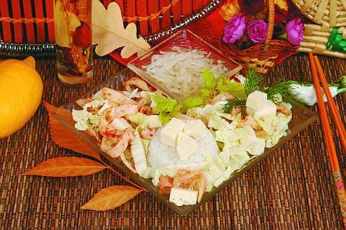 Кальмары нарезать полосками. Тофу нарезать кубиками. Капусту вымыть, мелко нарезать, смешать с кальмарами и тофу, посолить. Зелень укропа и сельдерея вымыть. Для приготовления соуса дайкон очис-тить, вымыть, натереть на терке, посолить и залить уксусом. Из риса сформовать 2 колобка, выложить их на тарелки, рядом положить приготовленную ранее смесь. Посыпать салат паприкой, украсить листиками укропа и сельдерея, подать с соусом из дайкона.