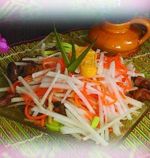 Мясо птицы в Японии используют в основном для приготовления первых и вторых блюд. Салаты из него встречаются значительно реже, чем, например, в русской или европейской кухне, и имеют выраженный национальный колорит. Он проявляется в необычном сочетании ингредиентов и использовании специфических приправ.