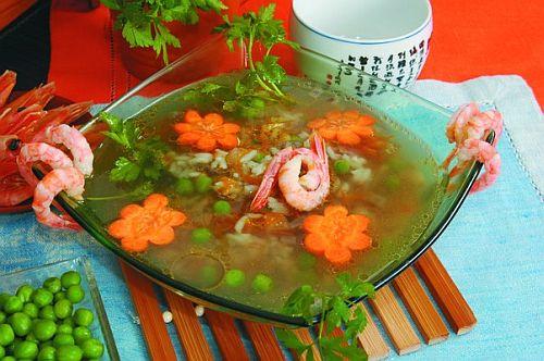 Креветки отварить в подсоленной воде, охладить, очистить. Рис отварить в подсоленной воде, откинуть на сито. Горошек бланшировать в кипятке 2–3 мин, охладить. Лук очистить, вымыть, мелко нарезать. Морковь очистить, вымыть, одну натереть на мелкой терке и спассеровать в масле вместе с луком, из второй вырезать украшения в виде цветов. Зелень петрушки вымыть. Даси влить в кастрюлю, довести до кипения, добавить спассерованные овощи. Рис, горошек и креветки разложить по тарелкам, залить даси. Украсить похлебку цветами из моркови и листиками петрушки.
