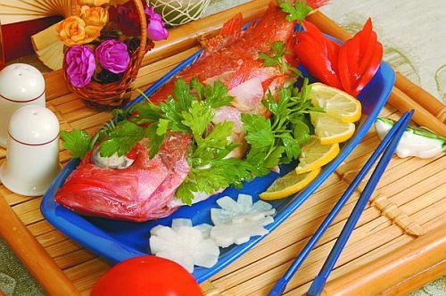 Дайкон вымыть, очистить, нарезать ломтиками, обжарить их в сливочном масле (несколько ломтиков оставить для украшения), добавить соевый соус, пере-мешать. Зелень петрушки вымыть. Лимон и помидор вымыть, нарезать ломтиками. Окуня выпотрошить, очистить, промыть, натереть солью и сбрызнуть лимонным соком. Нафаршировать рыбу обжаренным дайконом, положить в форму для запекания, смазать оставшимся маслом, залить бульоном и поставить на 20–25 мин, в предварительно разогретую духовку. Готовую рыбу выложить на тарелку, украсить ломтиками дайкона, лимона и помидора, оформить веточками петрушки.