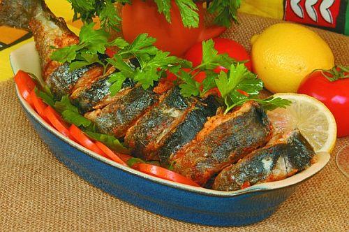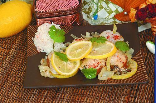 Подготовленную тушку рыбы нарезать порционными кусками, натереть солью, сбрызнуть лимонным соком и выложить в жаровню. Сметану смешать с яичным желтком, добавить паприку и имбирь, залить приготовленным соусом рыбу и поставить в предварительно разогретую духовку на 30–35 мин. Помидор вымыть, нарезать тонкими кружочками. Зелень петрушки вымыть. Готовую рыбу подать к столу в жаровне, украсив кружочками помидора, ломтиками лимона и листиками петрушки.