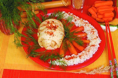Подготовленного судака нарезать порционными кусками, посолить, посыпать паприкой. Лук очистить, вымыть, нарезать кольцами, спассеровать в сливочном масле. Лимон вымыть, нарезать кружочками. Зелень кинзы вымыть. На лист фольги выложить лук, на него – куски судака и лимон. Плотно завернуть, поставить в предварительно разогретую духовку на 25–30 мин. Из риса сформовать небольшие колобки. Готовую рыбу вынуть из фольги, разложить по тарелкам вместе с рисовыми колобками, украсить листиками зелени.