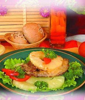 Свинину промыть, нарезать кусками толщиной 1–1,5 см, отбить, посолить, поперчить и обжарить в растительном масле. Листья салата и зелень петрушки вымыть. Помидор вымыть, нарезать ломтиками. Обжаренную свинину выложить в форму для запекания, сверху положить ломтики ананасов, посыпать сыром и поставить в предварительно разогретую духовку на 5–7 мин. Готовые отбивные разложить по тарелкам, оформить листьями зеленого салата, веточками петрушки и ломтиками помидора.