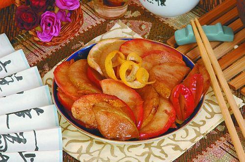 Яблоки и груши вымыть, удалить сердцевину, нарезать ломтиками. Апельсиновую цедру нарезать тонкими полосками. Сахар смешать с водой, довести до кипения, варить 3–5 мин, затем добавить кусочки шоколада и подогревать, помешивая, до полного его растворения. В сироп положить яблоки, груши и апельсиновую цедру, довести до кипения, снять с огня и оставить на 15–20 мин. Разложить ломтики фруктов по пиалам, полить шоколадным сиропом и украсить лимонной цедрой.