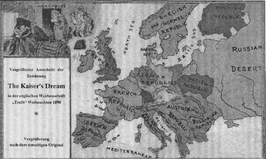 Памфлет и карта «разъясняли» суть неизбежного будущего. Названный «Сон Кайзера» памфлет гласил о том, что как будто бы кайзер Вильгельм II Гогенцоллерн едет простым пассажиром на поезде в Англию, чтобы найти приют в английском работном доме, так как произошла революция, и он лишился престола в своей стране. Вместе с памфлетом была опубликована карта, которую обычно называют фантастической.