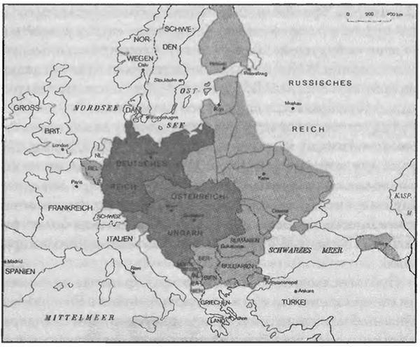 Соответственно «обеспечить пространство для левого крыла германской армии в следующей войне с Россией» означало заблаговременный захват вышеуказанного плацдарма, с которого и должно было развернуться стремительное наступление вглубь России по указанному направлению. Но чтобы захватить такой плацдарм в ситуации 1917–1918 гг., необходимо было юридически захватить эти территории (де-факто они и так были оккупированы немцами в ходе Первой мировой войны), что Гинденбург и пытался сделать на брест-литовских переговорах, выдвинув свою программу широких аннексий. Так оно и вышло по Брест-Литовскому договору от 3 марта 1918 г., но не надолго — в ноябре 1918 г. кайзеровская империя приказала долго жить. Продиктованные устремленными в будущее стратегическими соображениями в пользу следующей (обязательной!) агрессии против России аннексии хорошо иллюстрирует приводимая ниже германская карта тех времен.