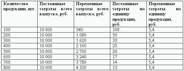 Таким образом, общая сумма переменных затрат изменяется прямо пропорционально объему производства, в то время как их величина на единицу продукции остается неизменной.
