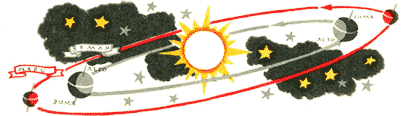 Нас сопровождает Луна, наша вечная спутница. Она кружится вокруг Земли и вместе с ней плывёт вокруг Солнца.