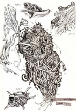 Особь является взрослым представителем рода Histrio расы тиррус (Сегментум Пацификус, родная планета неизвестна). Причина смерти — травма черепа в результате выстрела из лаз-пистолета и последующий системный отказ органов. NB: казнь через удушение неэффективна. (Подробные наблюдения с примечаниями — см. запись арко-стилуса в приложении). а. Основной сенсорный орган, аналогичен человеческому cranium (лат. череп). Наружная оболочка представляет собой ломкое слоистое белковое образование, лишенное наростов и пигментации, видимой на верхних слоях дермиса. Внутренняя капсула содержит мозговую ткань и соединяется с вертикальными "спинными" ганглиями (см. f). Вывод: сравнение с "мозгом" необоснованно, нервная система диффузного типа. b. Учетверенный орган зрения, предполагаемый периферический обзор 230 градусов. Прямой разрез обнаружил водянистую внешнюю мембрану (ср. хориоидеа) и губчатую сетчатку. В передней паре "глаз" заметны значительные скопления светочувствительных колбочек (избирательное восприятие длинноволнового излучения, напр., инфракрасного), а в задней паре преобладают скопления палочек (крайняя чувствительность к низким уровням освещения). c. Пищеварительный/дыхательный фильтр. Скопления волокон (микроскопические) губчатой ткани, имеющие решетчатую структуру. Периферическая мускулатура контролирует расположение и размер ячеек решетки. Вывод: как было отмечено (см. протокол наблюдения), объект извлекает питательные вещества благодаря процессу осмоса, меняя всасывающую способность ротовой области с помощью фиброзного "сита". Дыхательная функция, по-видимому, выполняется аналогичным образом (т. е. благодаря органическому "респиратору"). d. Неорганические детали (Гипотеза: одежда? броня?), отрезки магниевого кабеля. е. Две пары передних конечностей, вертикальное расположение. Каждая конечность трехсуставная, покрыта твердой белковой оболочкой (как и в случае a.), внутри — пронизанная связками мышечная сердцевина. Рудиментные пальцеобразные сегменты предполагают ограниченную хватательную способность. f. Горизонтальный разрез вскрыл ганглии внутренней нервной системы. Вертикальный "ствол" узла нервных волокон, заключенный в протеиновую оболочку, соединяет cranium (а.) с clavicula (g.) и поддерживает передние конечности. Вторичные (комплексные) узлы проникают во внешние кожные покровы (i, k, l.). Вывод: у особи отсутствует экзо- и эндоскелет, роль опорной структуры выполняет хрящевидная ткань. g. Подвижные придатки, аналогичные clavicula (лат. ключицы) головоногих. Необычайная плотность мышечных волокон свидетельствует о значительных силе и ловкости (Гипотеза: нижние конечности используются для быстрых и точных действий?). h. Репродуктивные органы? Пористый отросток с губчатой тканью на конце — семенник? Выводной канал для гамет? i. Основная мантия: толстая складка из внешних слоев дермиса с мускулистой задней стенкой (см. k). j. Вскрытие мантии: внутренняя полость практически лишена самостоятельных органов. Небольшое пищеварительное приспособление напрямую соединяется с системой клеточного обмена. Примитивный дыхательный орган (monovalvus; лат. одноклапанный), расположенный в верхней правой части полости, передает осмотические газы в верхние кожные слои и лежащую под ними мускулатуру. Вывод: химические процессы в теле особи идут на клеточном ур